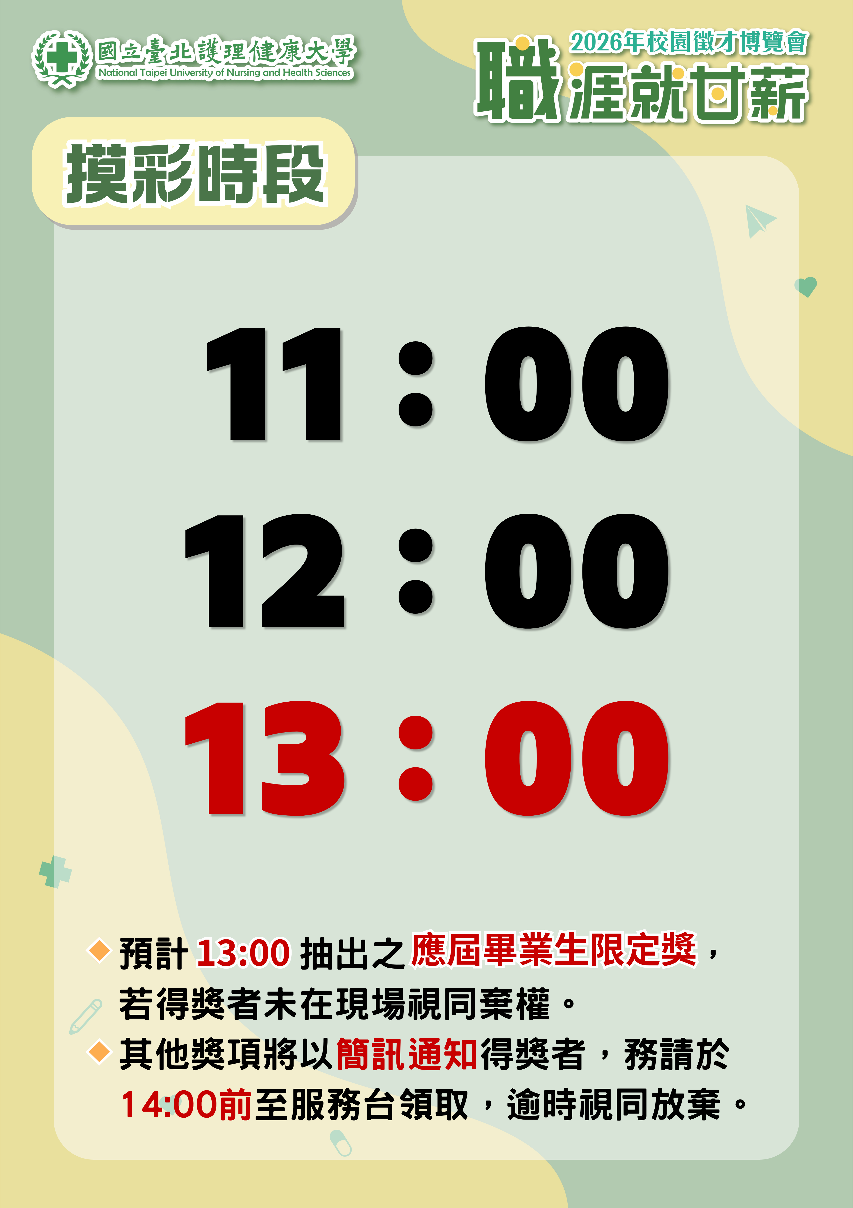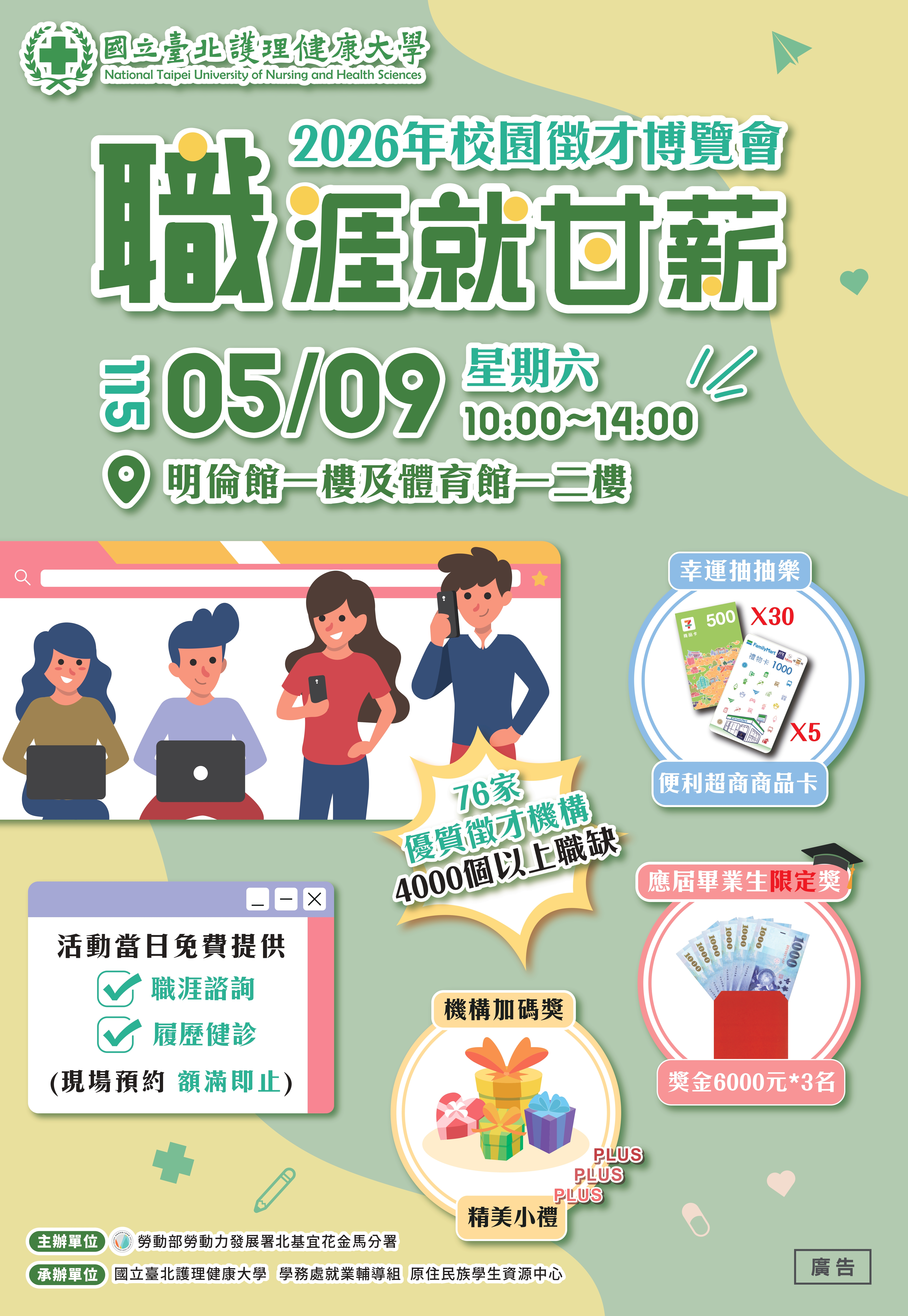 【活動資訊】本校謹訂115年5月9日(六)舉辦 2026年校園徵才博覽會「職涯就甘薪」,當日有多項摸彩禮品,歡迎踴躍參加!