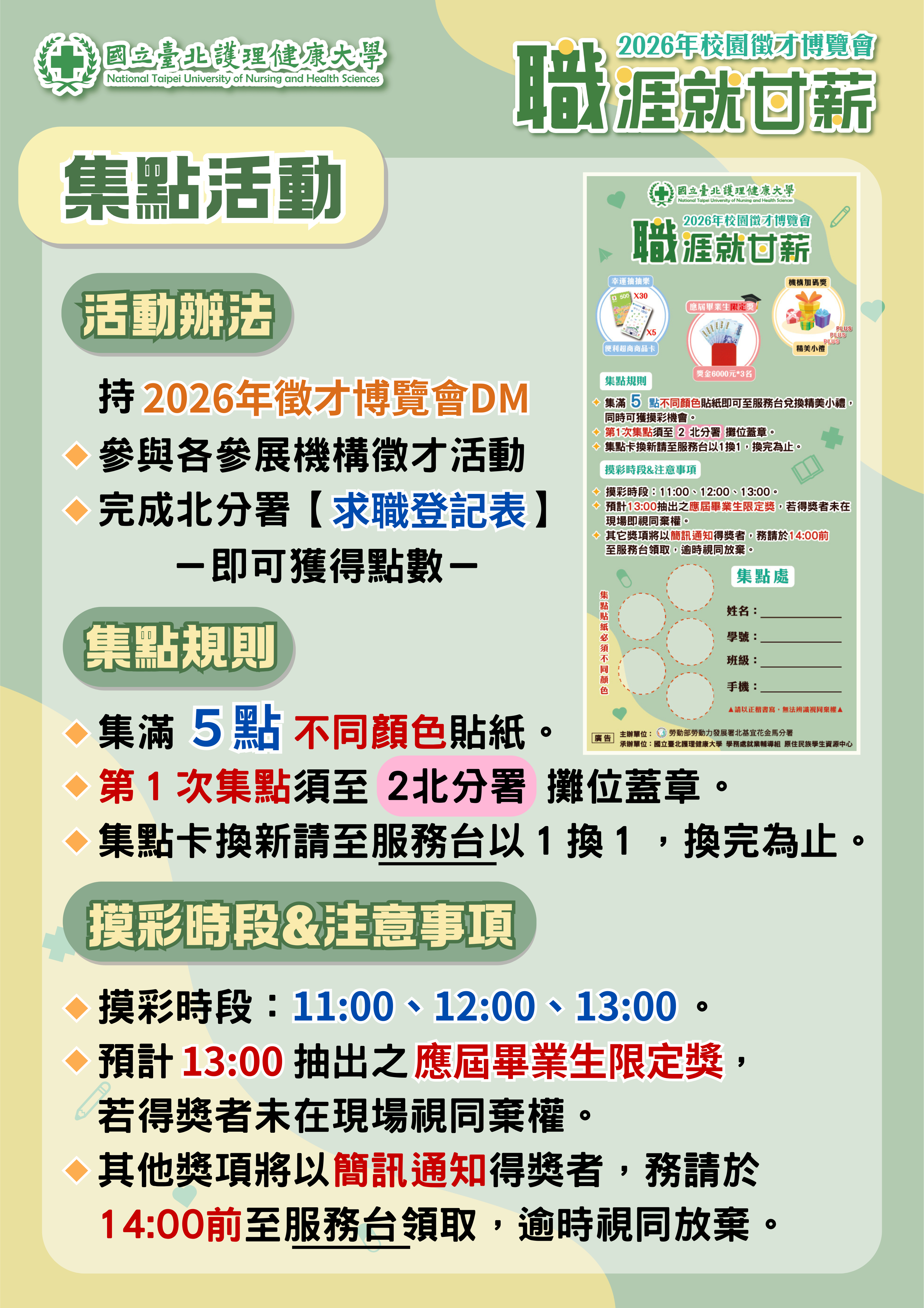- 參與各攤位諮詢、投遞履歷或面試,可獲1點,集滿5點(不同色)可至1號攤位服務台抽小禮品並投遞摸彩券。